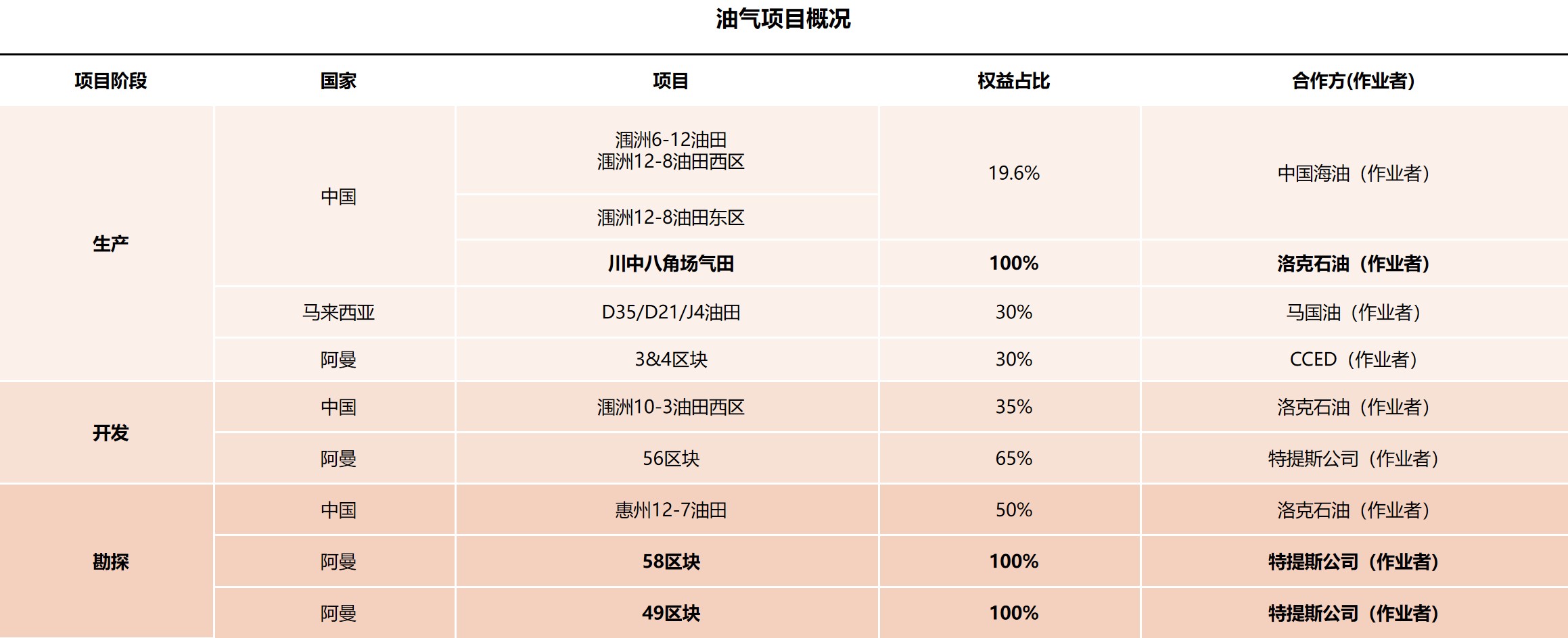 目前主要油氣項目位于中國四川、南海西部北部灣、南海東部珠江口、馬來西亞以及阿曼等地,目前日均油氣產量35000桶當量。